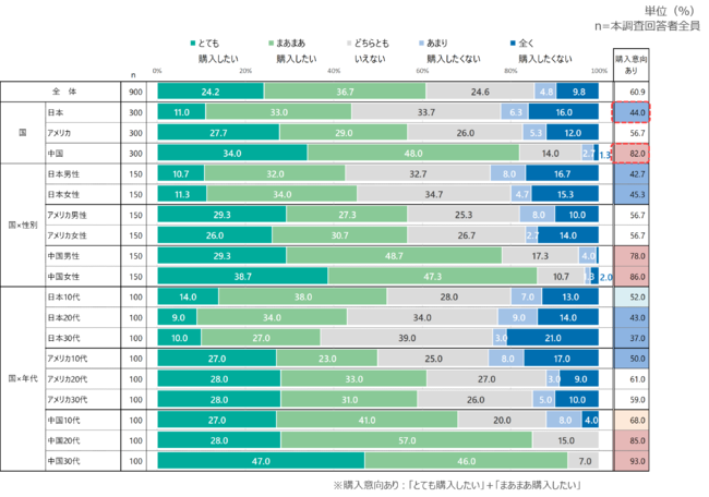 中国・アメリカは購入に前向きな回答が多い。特に中国は8割が購入意向あり。