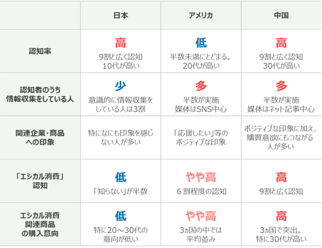 また、日本と比べて、アメリカや中国ではどの程度認知されているのか?認知だけではなく、「具体的な行動への関心」「関連企業・商品への印象」「エシカル消費の認知」「エシカル消費関連商品の購入意向」などについても日本・アメリカ・中国の3ヵ国でアンケート調査を実施し、その結果を比較してみました。