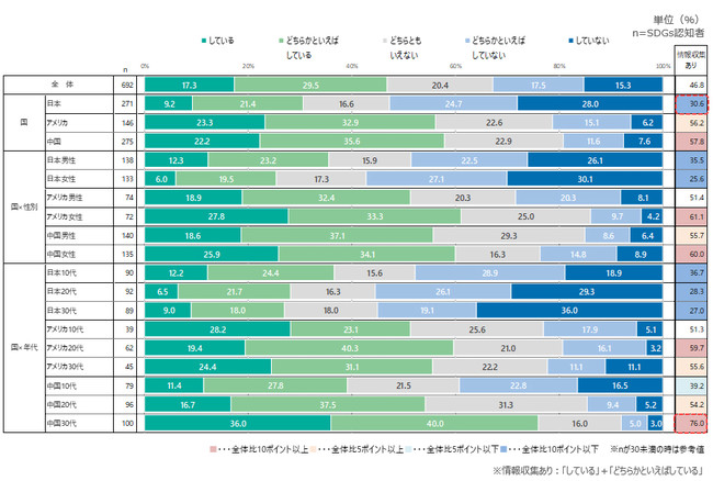 アメリカ・中国は情報収集をしている人が半数を超える。特に中国の30代は積極的な様子。