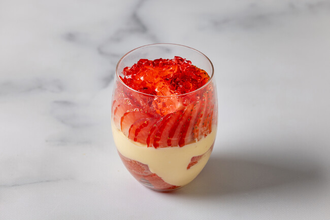 マルサラワインで風味づけしたコクのあるマスカルポーネから顔を覗かせるのは、自家製のベリーシロップがたっぷりと浸み込んだ、ピンク色のスポンジ生地。トップにはいちごゼリーと、スライスしたフレッシュのいちごをふんだんにあしらいました。クリームの濃厚さとベリーのフレッシュなフレーバーが絶妙にマッチした、ひと足早い春の訪れを感じさせるグラススイーツは、手土産にもおすすめです。