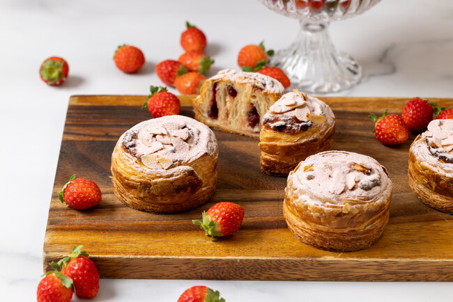 シロップで煮立てたドライストロベリーと、ラム酒が効いたいちごフレーバーのアーモンドクリーム、そしてホワイトチョコチップをデニッシュ生地で巻き上げました。トップに散りばめたアーモンドスライスは、食感と香ばしい味わいのアクセントに。ドライストロベリーパウダーを加えたパウダーシュガーをトッピングし、見た目も華やかに仕上げます。