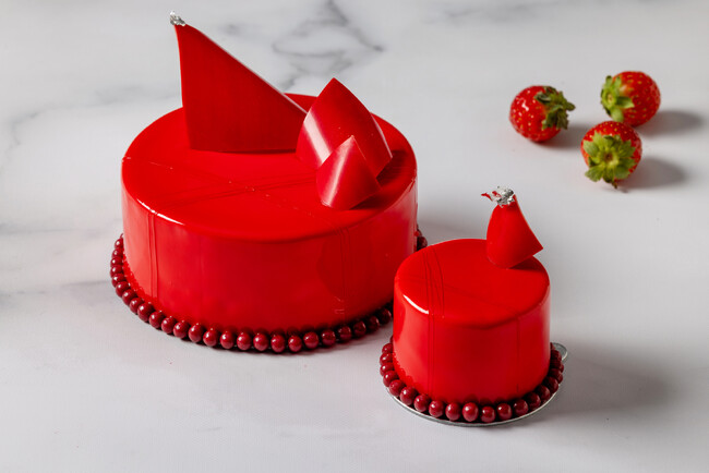 ピスタチオブリュレ、ピスタチオのスポンジ生地、フレーズ デ ボワ(野いちご)のジュレなど、5種類のフレーバーをストロベリームースで包み込み、チョコレートでコーティング。目にも鮮やかな真っ赤なムースケーキに仕上げます。いちごの甘みや爽やかな酸味、ピスタチオの濃厚かつ香ばしい味わいなど、それぞれの階層が織りなすハーモニーを心ゆくまでお楽しみください。
