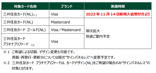 この度、2022年11月14日 より、より安心に、シンプル・スタイリッシュなキャッシュレス体験をお客さまにお届けできるよう、カードの裏面からサインパネル(署名欄)をなくした “サインパネルレス”のカードとして発行を開始いたします。