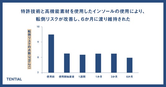 結果1.:特許技術と高機能素材を使用したインソールにより、高齢者の転倒リスクが低減され、その効果が6カ月間持続した