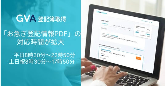 リーガルテックサービスの開発・運営を行うGVA TECH株式会社(本社:東京都渋谷区、代表取締役:山本俊、以下GVA TECH)は、法人の登記簿謄本取得オンラインサービス「GVA 登記簿取得」の「お急ぎ登記情報PDF」の利用時間と曜日を拡大したことをお知らせいたします。