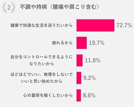2位は「不調や持病(肩こりや腰痛含む)」。50代で1位、60代で2位、70代以上では3位で、年代が若いほどランキングが上位だった。卒業したい理由の1位は「健康で快適な生活を送りたいから」、2位は「疲れるから」、3位は「自分をコントロールできるようになりたいから」。