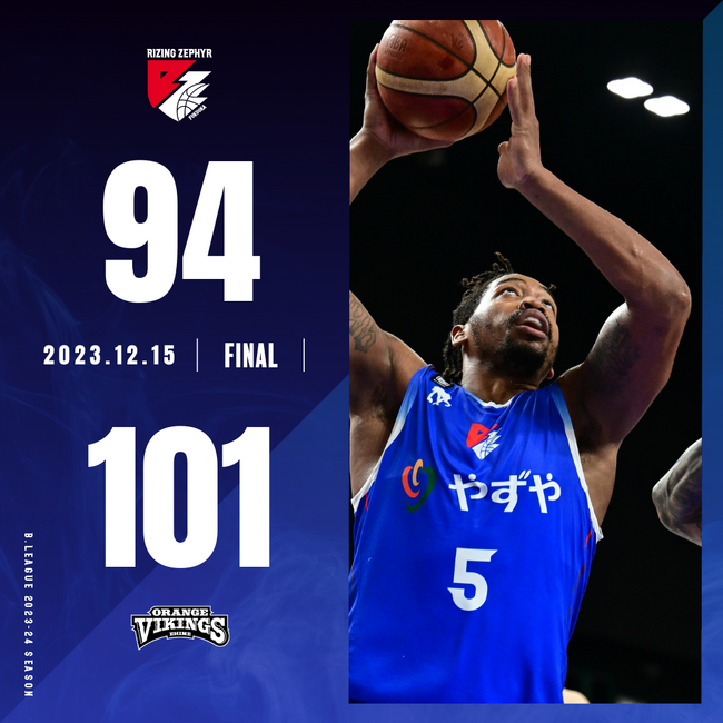 2023年12月15日(金)に開催されました【ライジングゼファーフクオカvs.愛媛オレンジバイキングス】において“福岡94-101愛媛”の結果となりましたことお知らせいたします。