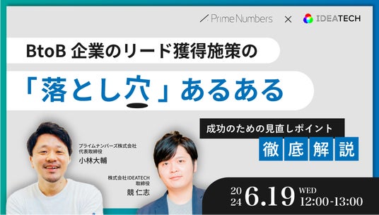 ファクトに基づいたコンテンツ開発とマーケティング支援を行う、株式会社IDEATECH(本社:東京都港区、代表取締役社長:石川友夫、以下 IDEATECH)は、プライムナンバーズ株式会社(本社:東京都新宿区、代表取締役:小林 大輔)と共同で、2024年6月19日(水)12:00~13:00に「BtoB企業のリード獲得施策の「落とし穴」あるある~成功のための見直しポイント徹底解説~」と題するオンラインセミナーを開催いたしますので、お知らせいたします。