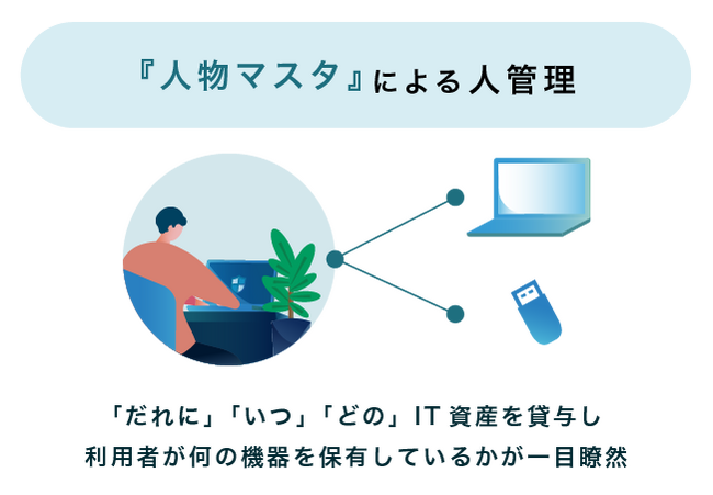 IT資産を人に紐づけて管理するため「人物マスタ」を搭載。誰に、いつ、どのIT資産を貸与し、利用者は何の機器を保有しているかが一目瞭然です。組織変更や人事異動、入退社で変化する人事情報と、IT資産に関わるさまざまな情報(在庫管理・棚卸、リース状況、保守期限、契約管理、資産の修理や廃棄など)の現状を可視化する仕組みで運用性を向上しています。