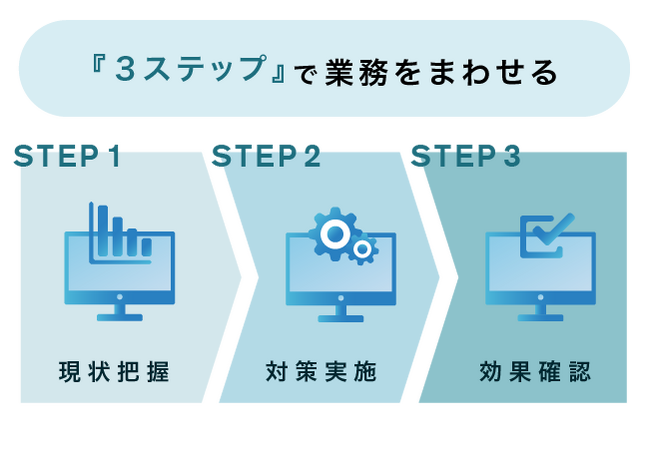 業務観点で設計された専用画面で現状把握、対策実施、効果確認の3ステップがスムーズにまわせるように設計されています。ひとつの業務を完了させるための複雑な手順や手間は不要です。