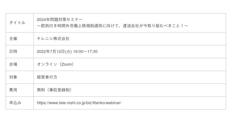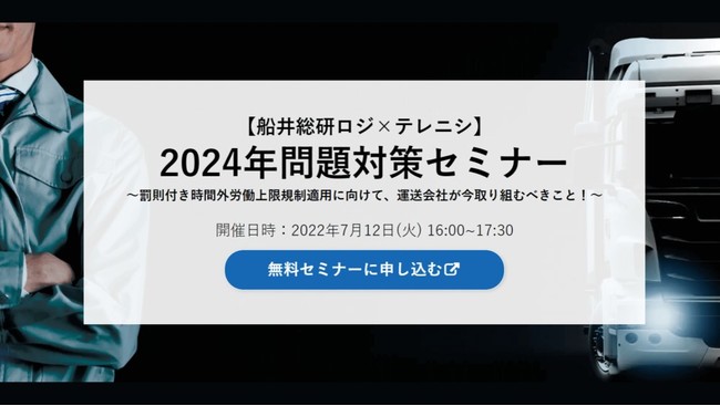 ロジスティクス・物流コンサルティングサービスを提供する船井総研ロジ株式会社(以下「船井総研ロジ」)のコンサルタント講演情報です。テレニシ株式会社が主催する運送・物流企業向けセミナー「2024年問題対策セミナー ~罰則付き時間外労働上限規制適用に向けて、運送会社が今取り組むべきこと!~」にて、船井総研ロジのコンサルタントが2024年問題解決に向けた人事戦略について解説します。
