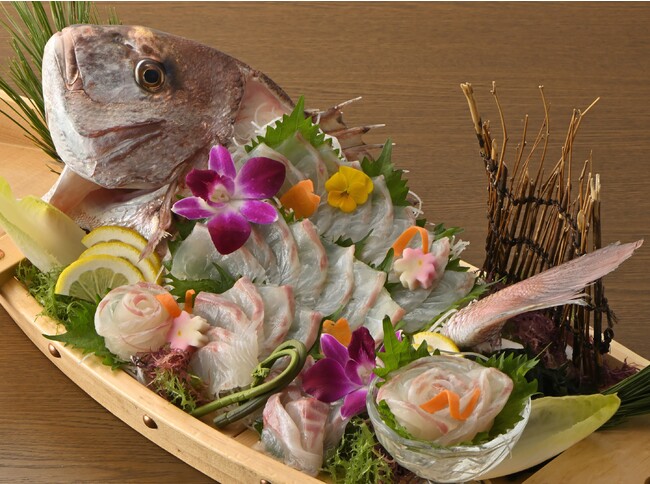 桜の開花の季節に獲れる瀬戸内の真鯛は「桜鯛」や「花見鯛」と呼ばれています。瀬戸内海の強い潮流の中を泳ぎ、豊富な餌を食べ、身が引き締まり旨みが凝縮され、仄かに桜色の身はプリっとした食感と、甘みのある味わいがお楽しみ頂けます。お刺身はもちろん、焼き魚や煮つけなどと色々な楽しみ方があります。このビュッフェでは、お刺身や握り鮨や鯛釜めし、漁師汁、アクアパッツァ、しゃぶしゃぶなどでお召し上がりいただきます。