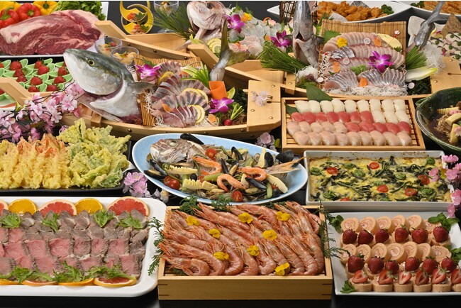 讃岐平野と瀬戸大橋が一望できる高台に建つリゾートホテル休暇村讃岐五色台(所在地:香川県坂出市大屋冨町、支配人:石橋 正浩)では、「香川のうまいもの」をコンセプトにしたご夕食「香川のうまいものビュッフェ」に3月から春らしいメニューが並びます。香川と瀬戸内の春を彩る旬の食材をテーマに、「桜鯛のお造り」をはじめ、産地だからこそ提供できる「生鰆のお造り」、県魚「ハマチ」など、日替わり5種類の新鮮なお魚をお楽しみいただけます。また、地元農家直送の讃岐野菜を使ったサラダや創作メニュー、ライブキッチンでは握り鮨や焼きたての「ひまわり牛ステーキ」や春らしい熱々の「山菜天ぷら」もご用意。旬の食材を使った春の香川と瀬戸内のうまいものビュッフェをぜひお楽しみください。