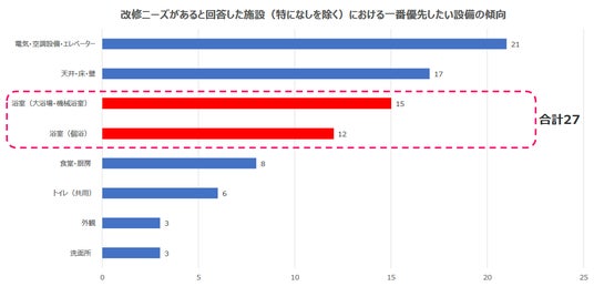 改修・改善したい設備で一番優先したい設備(単一回答)において、浴室(個浴)・浴室(大浴場・機械浴室)合わせた改修ニーズは31.8%となり、安全性・介護負担・利用者満足度の観点からも優先度が高いことが伺える