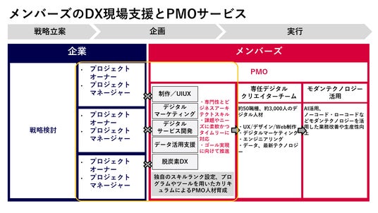 「PMOサービス」は、メンバーズが強みを持つ制作/UIUX、デジタルマーケティング、デジタルサービス開発、データ活用支援、脱炭素DXの事業領域に特化し、各領域における専門性とDXプロジェクトを一貫して推進するビジネスアーキテクトのスキルを兼ね備えたPMO人材が、企業のDXプロジェクトの企画から実行フェーズにおいて、上位戦略を理解し実行に落とし込みながら、現場での内製によるDX推進を伴走支援することが特徴です(※3)。