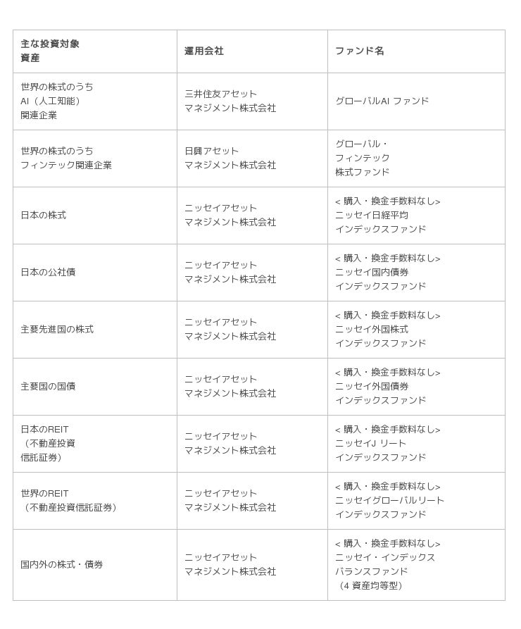 今回は話題のテーマ、AI(人工知能)とフィンテックに着目したファンドをそれぞれラインアップに加えたほか、ニッセイアセットマネジメントが展開する低コストにこだわったインデックスファンド< 購入・換金手数料なしシリーズ>の7本を追加しました。
