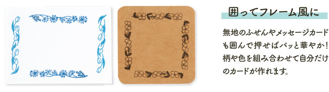 この度、ご好評を受けて新たに「手書き飾り」「和モダン」「とり」の3種類を増種することが決定しました。スタンプを押すだけで手帳やカードが華やかになるデザインで、水性ペンなどで色付けすると、よりかわいくデコレーションを楽しむことができます。