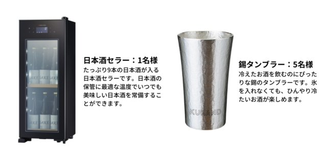 「酒ガチャスパークリング 2022」を購入いただいた方から抽選で1,000名様に、「酒ガチャスパークリング 2022」抽選特典がランダムで当たります。いつでも最適な温度でお酒が保存できる日本酒セラーや、冷たいお酒を飲むのにぴったりなグラスやタンブラーなど、夏の家飲みが楽しくなる抽選特典です。