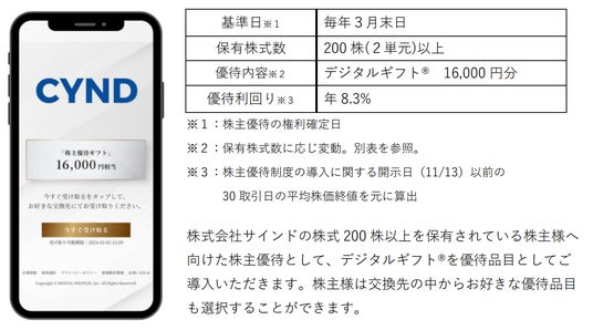 株式会社サインド(代表取締役社長:奥脇 隆司、東証グロース市場:証券コード4256)において、株式会社デジタルプラス(代表取締役社長:菊池 誠晃、本社:東京都渋谷区、東証グロース市場:証券コード3691)グループが運営する「デジタルギフト(R)」を株主優待としてご活用いただくことになりました。
