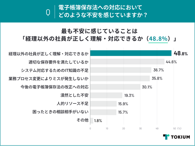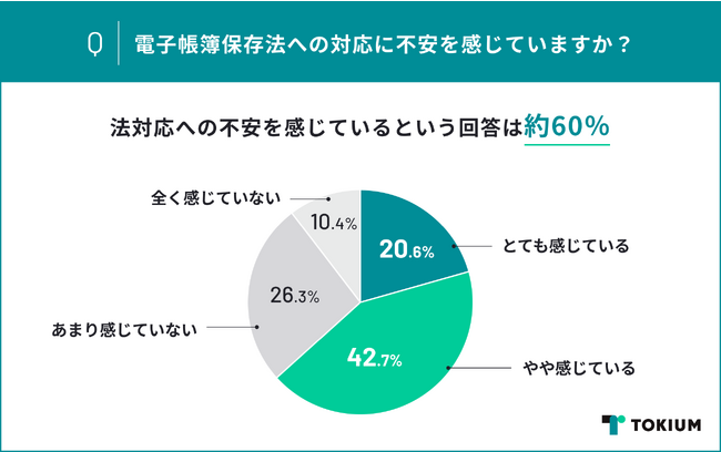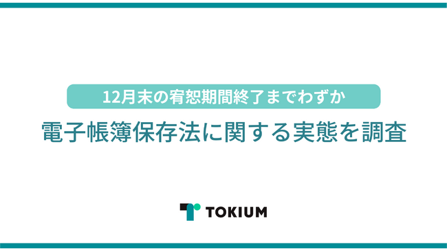 未来へつながる時を生む株式会社TOKIUM(本社:東京都中央区、代表取締役:黒崎 賢一、以下「TOKIUM」)は、全国の経理業務に携わる1046名を対象に、2023年12月末で宥恕期間が終了する電子帳簿保存法に関する調査を行いました。調査の結果、約20%以上が電子帳簿保存法に対応できておらず、約60%が電子帳簿保存法に不安を感じていることが明らかになりました。また不安に感じている点として、「経理以外の社員が正しく理解・対応できるか」がもっとも多くあげられました。