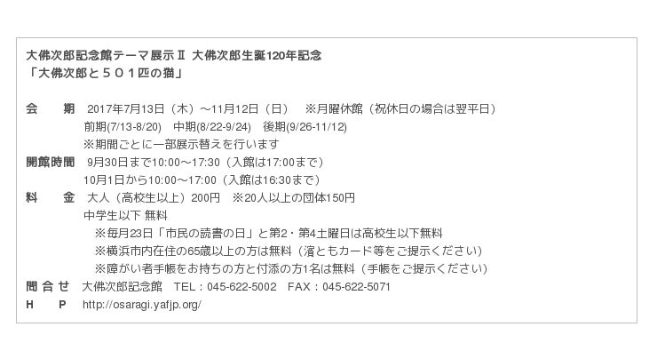 大佛次郎記念館(おさらぎじろうきねんかん/横浜市中区山手町113番地)では、大佛次郎生誕120年を記念した展示「大佛次郎と501匹の猫」が開催中です。
