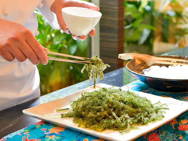 これまでも地産地消をテーマに卵、野菜、果物などを取り入れてきましたが、今回はさらにもう一歩先を行き、沖縄の代表的な食材である「もとぶ牛」「海ぶどう」「セーイカ」を朝からたっぷりと味わっていただきたい。首里の老舗「玉那覇味噌醬油」の味噌汁、沖縄そばやチャンプルー、大豆ミートを使ったタコライスなど、沖縄の食材と食文化で、みなさまを心よりおもてなしいたします。