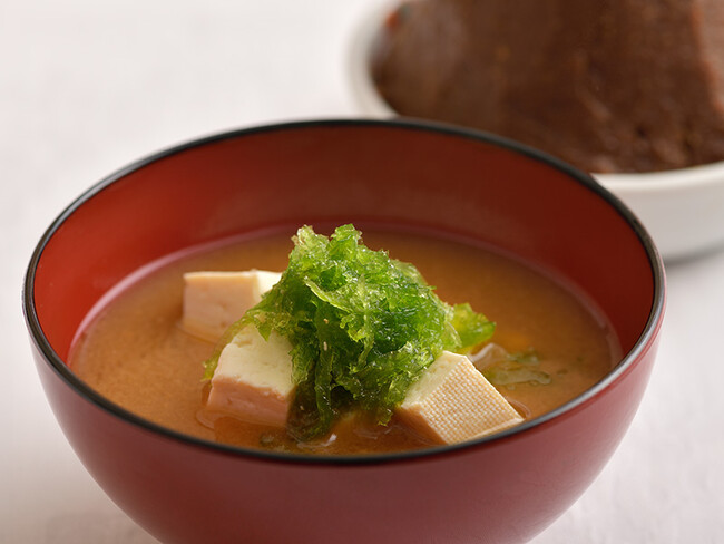 明治維新よりも前の安政時代(1855~60)、琉球王国時代に創業した「玉那覇味噌醬油」は、先の大戦で軍司令部がおかれた首里城に近く壊滅的な被害を受けましたが、戦後、消失を免れた木材をかき集め再建しました。自家製の米麹・麦麹、丸大豆、沖縄のシママース(沖縄の方言でマースは「塩」)を合わせ、昔ながらの天然醸造でじっくりとその時を待つ伝統的な製法を受け継いでいます。創業より170年、首里の老舗「玉那覇味噌醤油」の味噌、沖縄の島豆腐とアーサを使った「玉那覇味噌醬油の味噌汁」をご堪能ください。