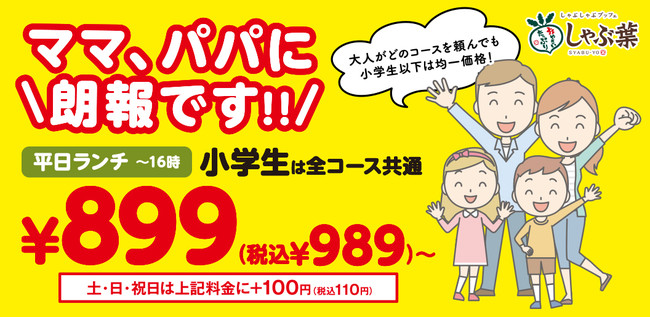 株式会社すかいらーくレストランツ(本社・東京都武蔵野市、代表取締役社長 大川原利明)が運営するしゃぶしゃぶ食べ放題のブランド「しゃぶ葉」では、2022年3月17日(木)より、小学生価格を全食べ放題コース均一価格に変更いたします。