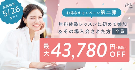学ぶから働くまでをサポートする女性向けキャリアスクール「SHElikes(シーライクス)」を運営するSHE株式会社(所在地:東京都港区、代表取締役CEO/CCO:福田恵里、以下SHE)は、入会金が2,5000円割引と初月月額料金が無料になる「今踏み出そう入会キャンペーン」第2弾を、5月17日(金)から5月26日(日)までの期間で開催します。