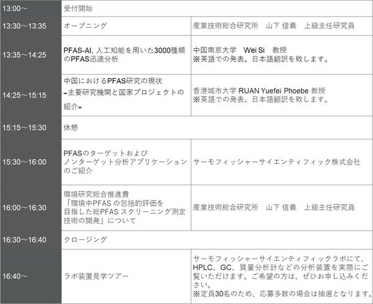 近年、環境問題として深刻化しているPFAS。その分析技術は日進月歩であり、特に人工知能の導入により新たな可能性が広がっています。 この度、国内PFAS対策中心組織の一つであるPFAS対策技術コンソーシアム様、PFAS測定装置メーカーのサーモフィッシャーサイエンティフィック株式会社様と協力し、PFAS測定技術に関する勉強会を下記内容で開催します。今回の勉強会では、PFAS分析の最前線で活躍する、中国南京大学および香港城市大学の専門家を講師にお招きし、人工知能を利用したノンターゲット分析も含めた、中国PFAS研究について最新の技術や知見をご講演いただきます。また、講義後にはサーモフィッシャーサイエンティフィック株式会社様の最新装置に実際に触れながら、ラボ見学も可能です。