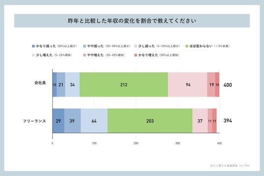 ビジネスパーソンに昨年と比較した年収の増減を聞いたところ、大半が「ほぼ変わらない」と回答しました。なお、年収に変動があった人では、会社員は「年収が増えた」人が多く、フリーランスは「年収が減った」人が多いことがわかります。