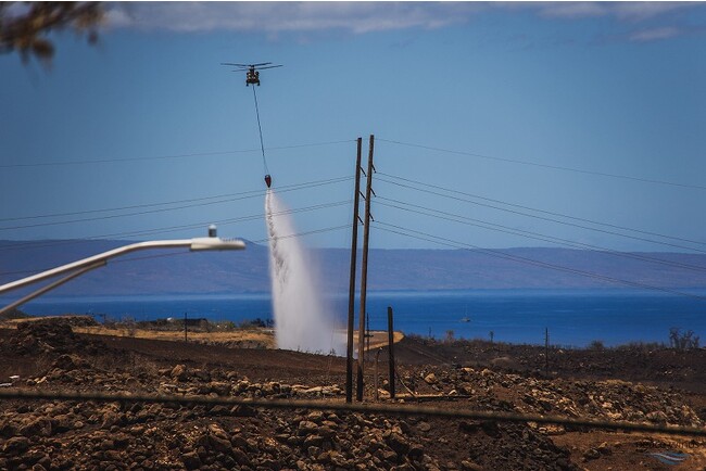 到着してすぐ、被害が大きいラハイナを視察した際、火が上がっている様子はありませんでしたが、今も上空から大型輸送ヘリによる消火活動が行われており、草原では今もくすぶっている箇所があるのかもしれません。乾燥した高温状態が続いているので、更なる被害の予防のための散水という可能性もあります。