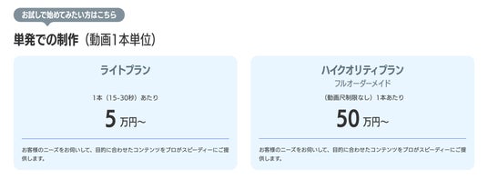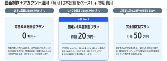 完全成果報酬型のSNS運用代行や、1本5万円からの動画制作プランなど、お客様のニーズに応じた最適なプランを提供します。