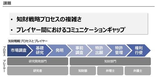 弊社が課題として捉えている、「知財戦略に関与する複数プレイヤー感におけるコミュニケーション」をAIで円滑に支援し、リサーチやアイデア創発、特許の権利化、活用においてトータルプラットフォームを提供します。