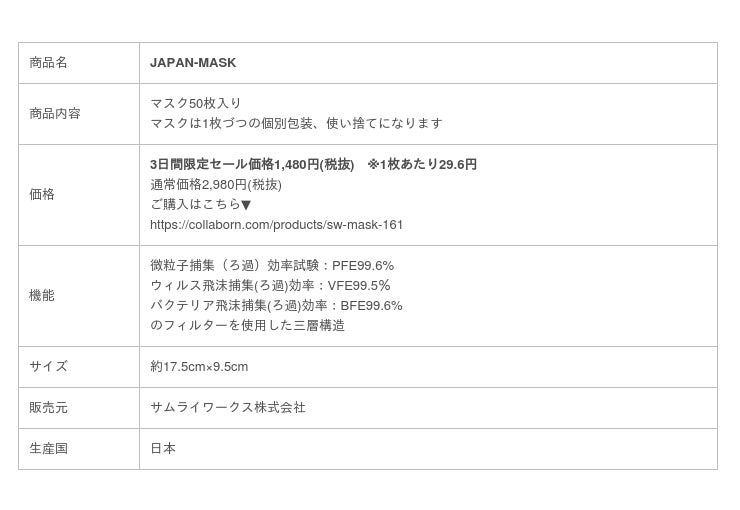 サムライワークス株式会社(代表取締役社長:新島 実 本社所在地:東京都渋谷区)は、敏感肌の方にもご使用頂けるよう内側の肌に触れる素材には、赤ちゃんのおむつにも使用できる低刺激でアレルギーフリーな素材と、医療用レベルの高性能フィルターでウイルスや細菌の侵入を防ぎ、耳痛を防いでくれる幅広の耳紐を使用した、日本製の高品質マスク『JAPAN-MASK』を新発売致します。また、多くのお客様にご使用して頂きたくため、販売開始セールを3日間限定で実施!
