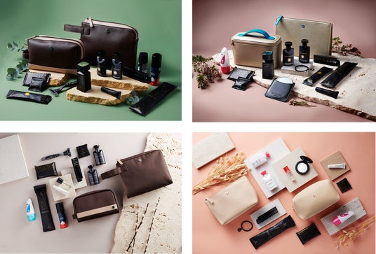 お客様に卓越した機内体験を提供するという取り組みの一環として、さまざまなカラーとファブリックを組み合わせた新しい8種類のポーチを、ご旅行に役立つ様々なアイテムとともにファーストクラスとビジネスクラスに用意しています。エミレーツ航空限定デザインのボトルに入ったブルガリのフレグランス、ハイパフューマリー コレクションの「ブルガリ レ ジェンメ」ほか、ゴールドラッカー仕上げのブルガリ特製ミラー、旅行用のさまざまなケア製品、さらに新たに追加されたスポンジ製の耳栓やソフトなヘアゴムも含まれています。
