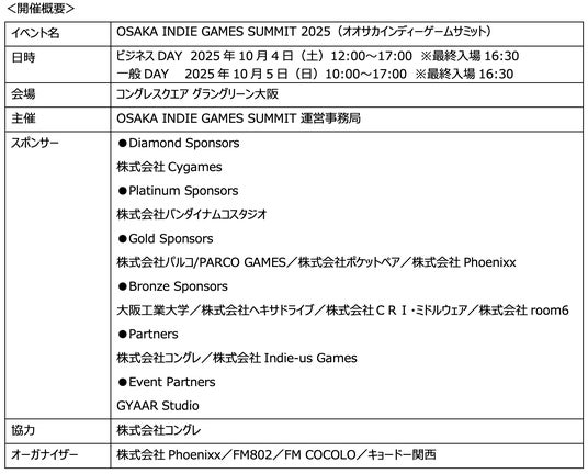株式会社Phoenixx(フィーニックス)(東京都武蔵野市、代表取締役社長:坂本 和則)は、インディーゲームをはじめとした、様々なクリエイターの才能が集まる”関西から世界へ”をテーマにしたイベント『OSAKA INDIE GAMES SUMMIT』において、国内外のクリエイター約120タイトルの出展が決定したことをお知らせします。