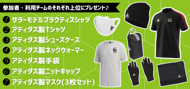 アディダスフットサルパークでは、個人・チームそれぞれのお客様のご参加・ご利用回数を競うランキングを実施いたします。対象者・対象チームそれぞれの上位にはノベルティをプレゼントいたします。皆様のご参加・ご利用をお待ちしております。