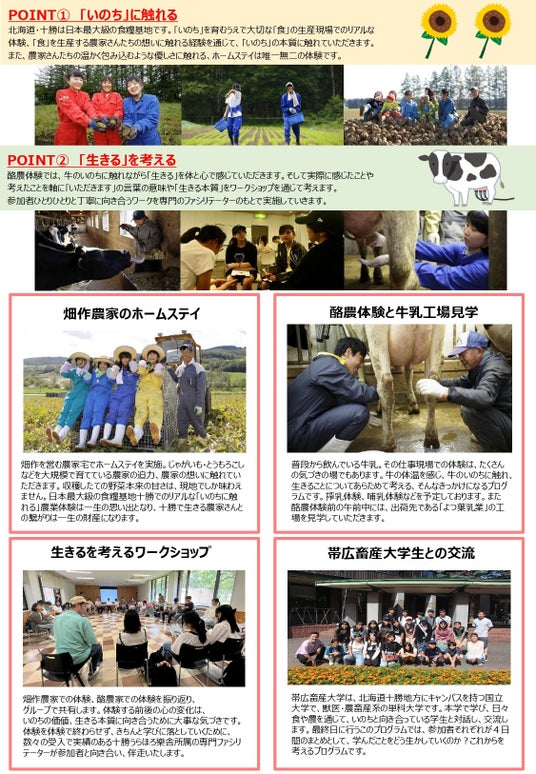 命の糧・食を育む大事な場所である農村漁村とのつながりが希薄になっていると言われる現代社会において、本来人が生きていくうえで根幹となる「食」について、食料自給率1,100%超を誇る日本の食糧基地である北海道十勝地方を舞台に本物の農林漁業に触れ、「食」や「いのち」について、次代の担い手となる中学生・高校生の皆さんに、新たな視点で考えてもらうことを狙いとしています。農家さん宅でのホームスティやふれあい、そして酪農体験での牛のいのちへの気づきなどを通じ、「いただきます」の言葉の意味や「生きる本質」についてワークショップで考えを深め、地域における次世代の担い手育成への一助となることも目的とした取組みです。