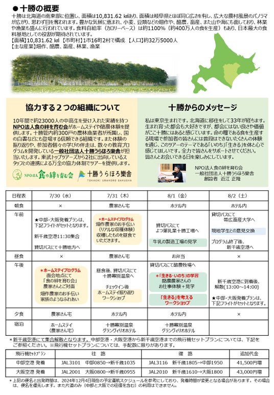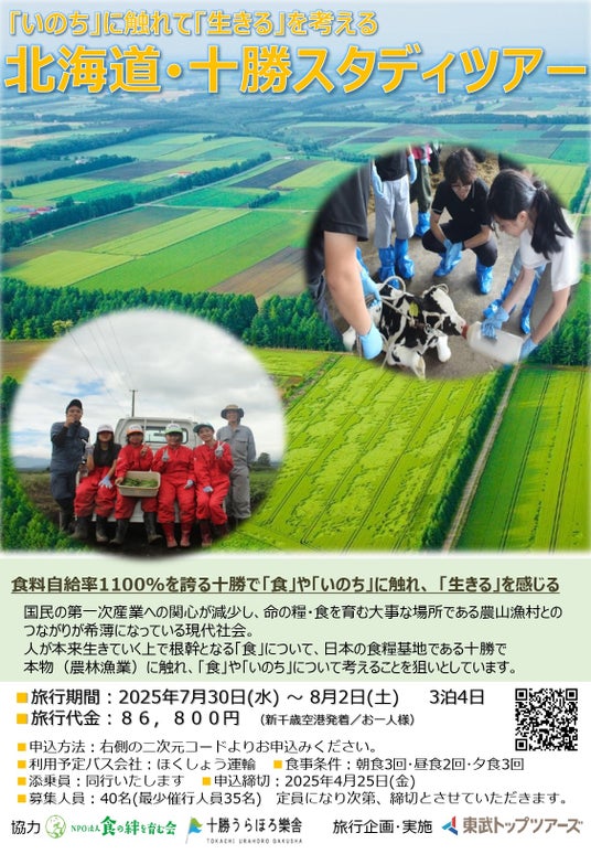 東武トップツアーズ株式会社(本社:東京都墨田区、代表取締役社長:百木田康二)は、「NPO法人食の絆を育む会」(所在地:北海道十勝郡浦幌町、理事長:近江正隆)と「一般社団法人十勝うらほろ樂舎」(所在地:北海道十勝郡浦幌町、代表理事:山内一成)にご協力いただき、2025年夏実施の中学生・高校生を対象とした”「いのち」に触れて「生きる」を考える北海道・十勝スタディツアー”を企画し販売いたしますのでお知らせします。