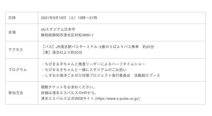 しずおか海洋ごみゼロ対策プロジェクト実行委員会は、9月18日(土)IAIスタジアム日本平で行われる清水エスパルスVSベガルタ仙台戦にて、ちびまる子ちゃんとハーフタイムショーを開催いたします。このイベントは、日本財団が推進する海洋ごみ対策プロジェクト「海と日本プロジェクト・CHANGE FOR THE BLUE」の一環で開催するものです。