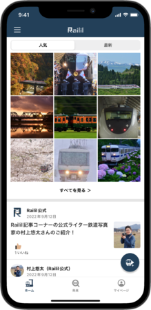 多数のリアクションを獲得した人気の鉄道写真は「ホーム」タブの『人気』欄に登場します。
