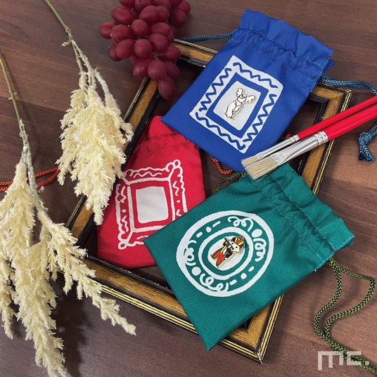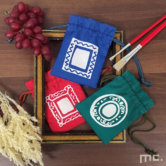 ミニフレーム巾着 550円手描きの額縁がポイントの小さな巾着。赤、青、緑の3色展開となっております。