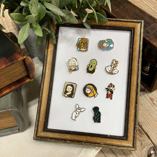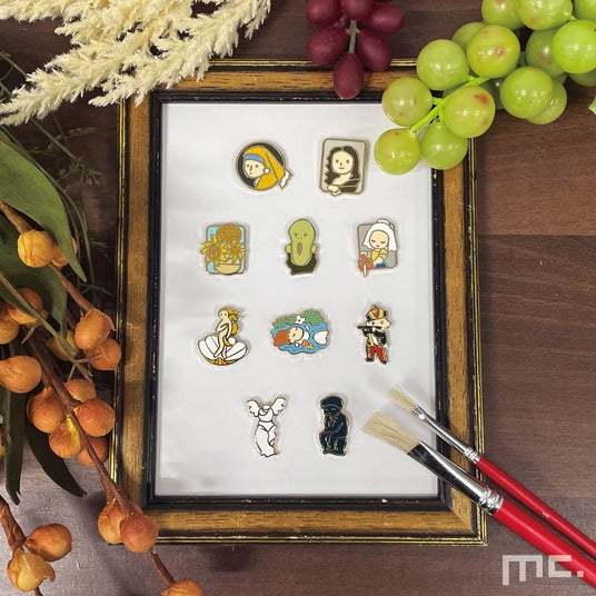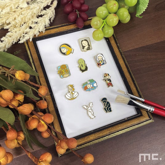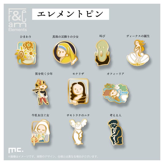 エレメントピン 550円本シリーズもう一つの核となる”エレメント”のピンバッジ。名画や美術品をモチーフに、デザインいたしました。全10種類の展開です。