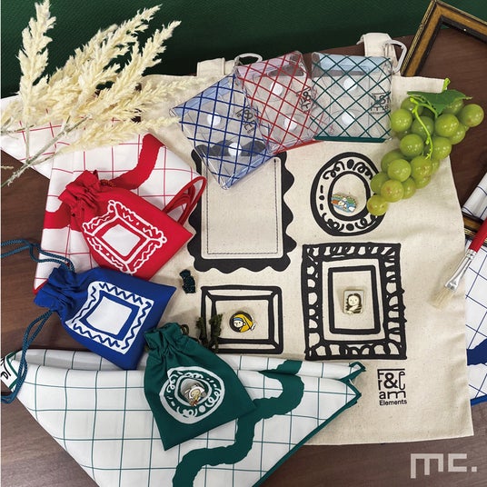 文具女子博横浜、大阪、トーキョーにて販売いたしました、マリモクラフトオリジナル「Frame&Elements」シリーズの一部商品をマリモクラフトオンラインショップでも販売いたします。”私だけの美術館”をテーマに、トートバッグ、ミニ巾着、ピンバッジ、ハンカチスカーフ、クリアマルチケースSSの5種類のアイテムをオンラインショップにて販売中です。