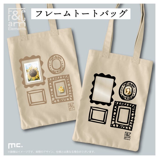 フレームトートバッグ 2,200円本シリーズの核となるアイテム。手描きの額縁がポイントのフレームトートバッグです。チェキなどを入れられるクリアポケット付きで、雰囲気の異なるベージュとブラックの2色展開となっております。