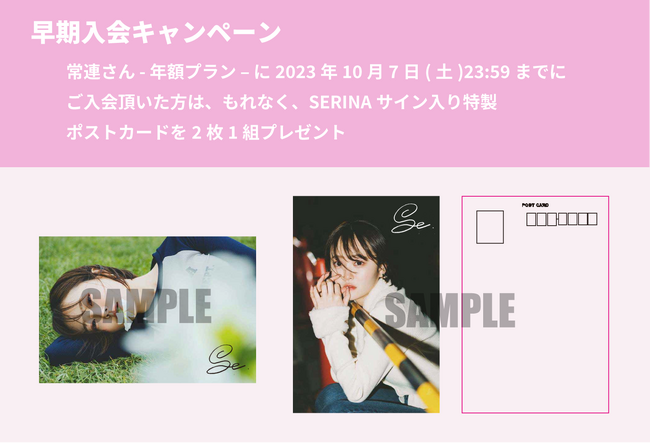 さらに、早期入会キャンペーンとして、2023年10月7日(土)23:59までに【常連さん-年額プラン-】に入会いただいた方へ、サイン入り2枚1組のポストカードをもれなく差し上げます。