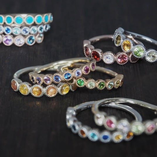 カラーストーンやダイヤモンドの色合いに、繊細なミルの輝きが寄り添い、主張しすぎることなく、静かな美しさを感じられるデザインです。日常の装いにも自然に溶け込み、長く身につけていただけるリングとして支持されています。