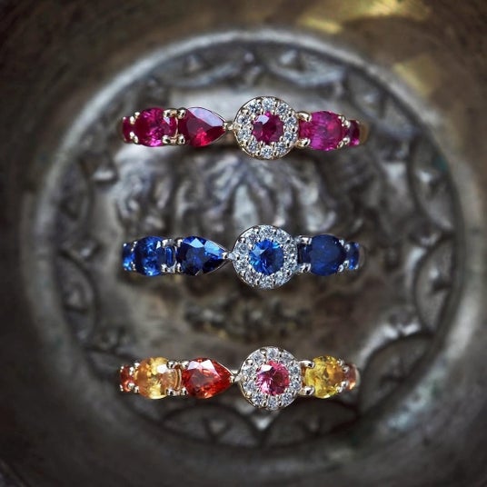 一本の指環に、色・形・大きさの異なる6つの宝石を留め、小さな花冠のような佇まいに仕立てました。ペアシェイプ、ラウンド、オーバルなど、それぞれ表情の異なる宝石が一本の中で響き合いながら、ひとつの調和を生み出すデザインです。石の組み合わせや配置は、一石一石の個性を損なわないよう精緻に計算されており、異なる輝きが自然に引き立て合うよう構成されています。