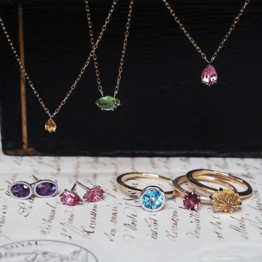 オーバルやラウンド、マーキス、スクエアなど、一つ一つ表情の異なる石を実際に見比べながら、ご自身の感覚に合う一点もののジュエリーをお選びいただけます。